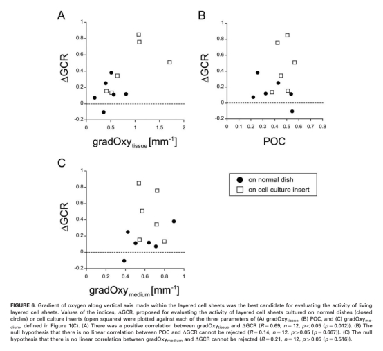 使用丹麥Unisense氧微電極測量的數據具有重要研究意義,主要體現在以下幾個方面:首先,電極高精度地測量了垂直軸上的氧濃度剖面(如圖2和圖4所示),能夠直接檢測組織內部和周圍的氧分布,從而反映細胞的呼吸活動。例如,研究顯示在培養初期(第0天),雙層和三層細胞片內部出現缺氧區域,氧濃度低至0.05 Csat以下,而隨著培養時間推移,缺氧區域減少,氧濃度升高到0.3-0.5 Csat,這種變化與細胞活性和代謝率直接相關。其次,通過測量組織內部氧梯度 (gradOxy_tissue),研究證實該參數與葡萄糖消耗率變化 (ΔGCR) 呈正相關(相關系數R=0.69,p=0.012),如圖6所示,表明氧梯度可以作為一種可靠的實時指標來評估組織活力,這是因為氧梯度與氧消耗率成正比,反映了細胞的代謝強度。此外,與培養基氧梯度 (gradOxy_medium) 和POC相比,gradOxy_tissue受培養條件(如多孔膜)影響較小,更穩定地指示內部活動。意義在于,這種實時監測方法避免了破壞性檢測,為優化培養條件(如氧氣供應)提供了直接依據,并有望應用于臨床前組織質量控制和再生醫學中的個性化治療。