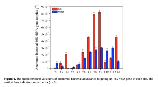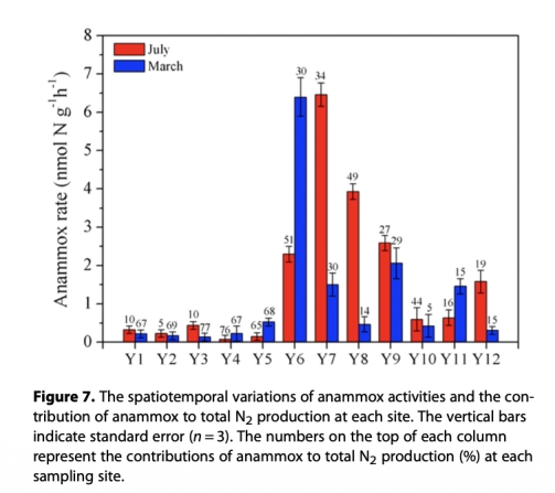 4. 反硝化速率數據:來自同位素示蹤,數據體現在圖8。研究意義是比較anammox與反硝化的關系,顯示兩者活性正相關,支持anammox和反硝化可能耦合的假設。