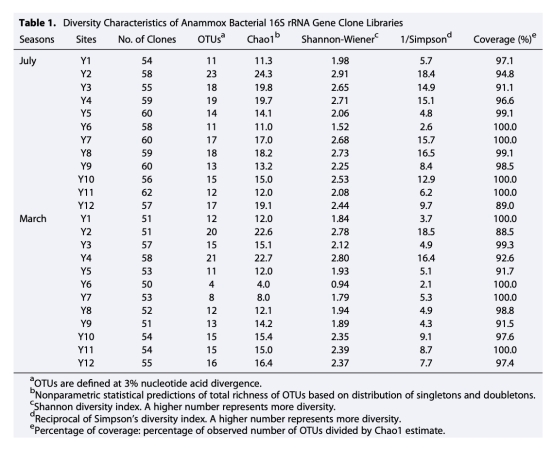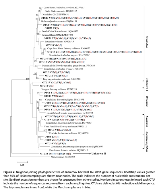 1. anammox細菌多樣性數據:來自16S rRNA基因克隆庫,數據體現在表1,以及圖2的系統發育樹。研究意義是揭示anammox細菌群落結構沿鹽度梯度的變化,幫助理解鹽度對微生物分布的生物地理影響。圖2顯示了群落組成的系統發育關系。