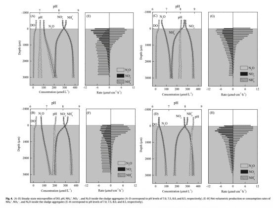2 測量了污泥聚集體內部的微環境參數,包括溶解氧、pH、銨氮、亞硝酸鹽和N2O的濃度剖面。數據來自圖4(A-D),顯示溶解氧在外層消耗殆盡,內層呈缺氧狀態;N2O濃度隨深度增加,且低pH下更高。研究意義在于揭示N2O產生的空間異質性,幫助識別亞硝化(外層)和反硝化(內層)途徑的貢獻,為理解微生物反應機制提供微觀證據。