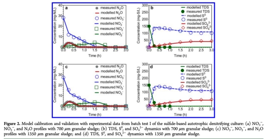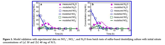 3. 數據來自圖4和圖5:測量了硫基AD過程中的硝酸鹽(NO3-)、亞硝酸鹽(NO2-)、氧化亞氮(N2O)和硫酸鹽(SO42-)的動態變化,用于模型校準和驗證。研究意義是證實模型適用于硫基AD系統,揭示N2O積累模式,并支持模型在不同條件下的適用性。