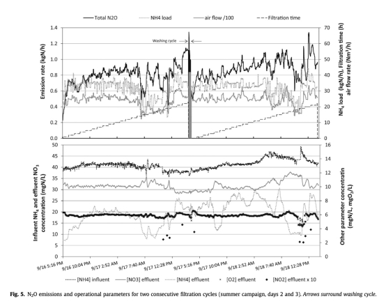 3 數(shù)據(jù)來(lái)自圖5:測(cè)量了過(guò)濾周期內(nèi)N2O排放和操作參數(shù)(如銨濃度、曝氣流量)的變化。研究意義是顯示N2O排放隨過(guò)濾時(shí)間增加,表明生物膜擴(kuò)展可能促進(jìn)排放,為優(yōu)化反沖洗頻率提供見(jiàn)解。
