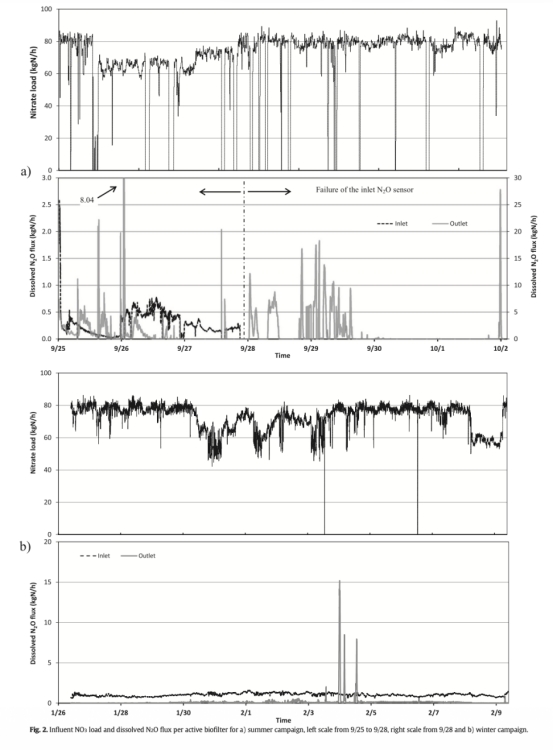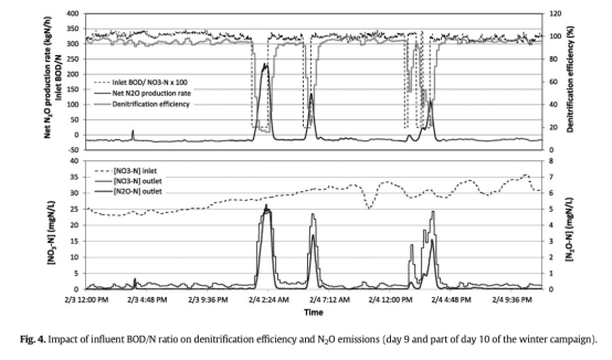 3. 數(shù)據(jù)來自圖4:測量了冬季 campaign 中進水BOD/N比對反硝化效率和N2O排放的影響,顯示BOD/N比下降時N2O排放增加。研究意義是表明碳可用性是N2O生產(chǎn)的關(guān)鍵因素,低BOD/N比導(dǎo)致反硝化不完全和N2O積累,為優(yōu)化碳劑量提供依據(jù)。
