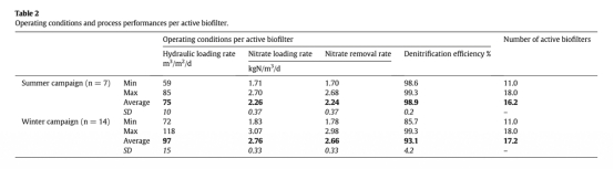 5. 數(shù)據(jù)來自表2:總結(jié)了夏季和冬季 campaign 的操作條件和過程性能,包括水力負載率、硝酸鹽去除率等。研究意義是顯示生物濾池在兩種條件下均具有良好的脫氮效率,但冬季效率較低,與N2O排放變化相關(guān),幫助評估過程穩(wěn)定性。