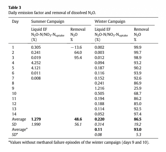 6. 數(shù)據(jù)來自表3:計算了每日N2O排放因子和溶解N2O去除率。研究意義是量化N2O排放占硝酸鹽攝取的比例,顯示平均排放因子較低,但變異性高,突出需要優(yōu)化操作以減少環(huán)境影響。