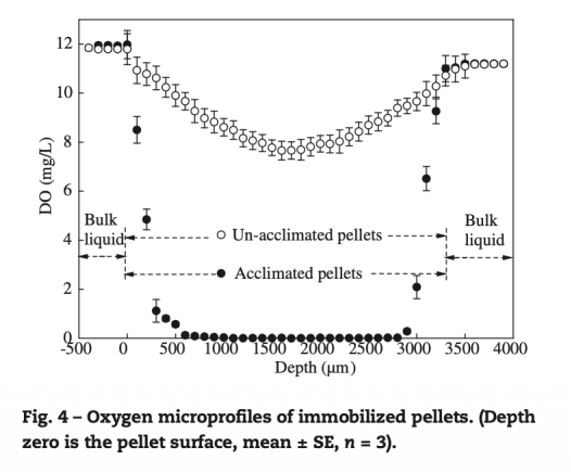 4 氧氣分布數據:來自圖4的微電極測量,顯示顆粒表面0-300μm處氧氣梯度最大(0.035 mg O2/(L·μm)),內部600μm處氧濃度接近0 mg/L。研究意義是揭示氧氣限制在顆粒內部,表面好氧區主導硝化,指導優化顆粒設計以增強傳質。