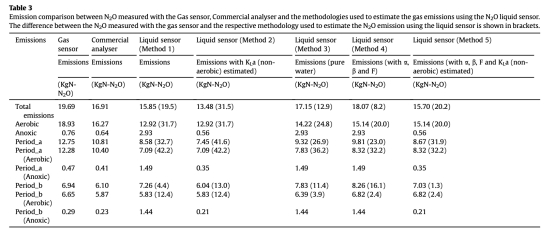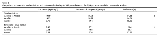 3 數據來自圖3和表2:測量了全規模SBR在4天監測期內氣相N2O排放動態,比較氣體傳感器和商業分析儀的結果。總排放量氣體傳感器為19.69 kg N-N2O,商業分析儀為16.91 kg N-N2O,差異14.1%。研究意義是傳感器在高濃度峰值(>500 ppmv)時更準確,商業分析儀飽和導致低估,突出傳感器在捕捉峰值排放方面的優勢,對準確評估溫室氣體排放因子至關重要。