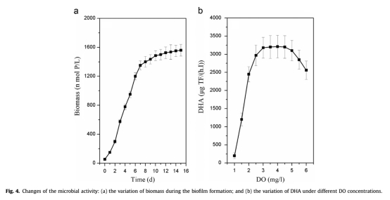 3 測量了生物量和脫氫酶活性(DHA)。數據來自圖4(a)和(b),顯示生物膜形成過程中生物量的增長及DO濃度對DHA的影響。研究意義在于評估微生物活性和降解能力,表明DO濃度3 mg/L時DHA最高,優化了生物反應條件。