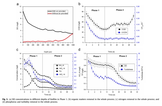 1 測量了化學需氧量(COD)、UV254、氨氮(NH3-N)、總氮(TN)、總磷(TP)和濁度等水質指標的變化。數據來自圖5(b、c、d)和表1。研究意義在于量化污染物去除效率,顯示增強MABR能有效降解有機物和去除氮磷,其中COD和UV254的去除表明大分子有機物和芳香化合物的降解,氮磷濃度降低證明生物同化作用。