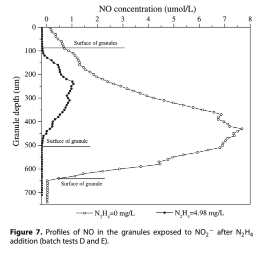 2 測量了NO在污泥顆粒和液體中的濃度分布,使用丹麥Unisense微電極進行實時監(jiān)測。數(shù)據(jù)主要來自圖5、圖6和圖7,顯示了NO在不同N2H4濃度下的空間分布和總量變化。