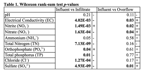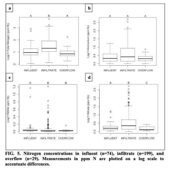 1. 所研究的生物滯留設施是氮和磷的凈來源,而非匯。滲濾液中的總氮和硝酸鹽濃度顯著高于進水。