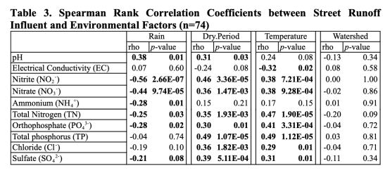 3. 測量了其他理化指標的數據:包括pH值、電導率、硫酸鹽和氯化物。這些數據有助于了解其他溶質(如除冰鹽)在生物滯留設施中的行為。數據主要來自表1和表2。研究意義在于揭示了除冰鹽在土壤中的積累和沖刷效應,以及土壤和植被對pH的緩沖作用。
