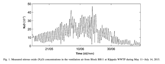 1 測量了廢氣通風系統中的N2O濃度隨時間變化,數據來自圖1,顯示日度和周度波動。