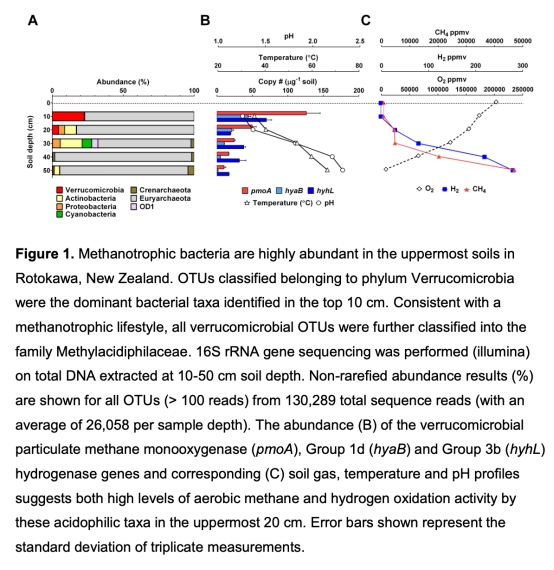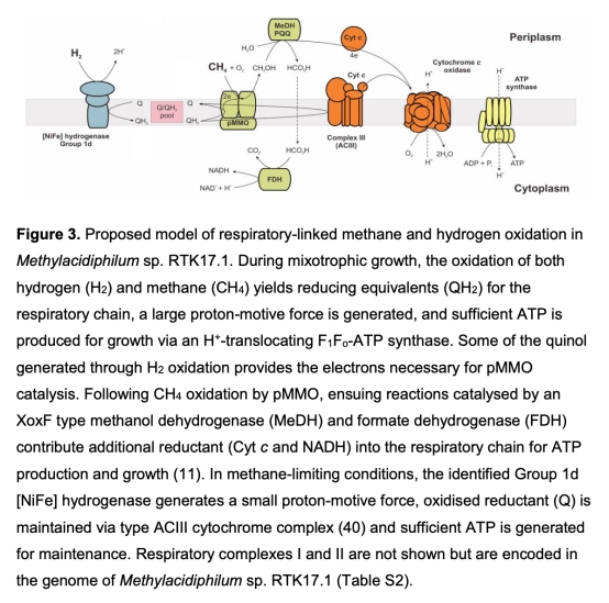 這篇論文摘要指出,甲烷氧化細菌是土壤中重要的甲烷生物過濾器,但傳統觀點認為它們是專性甲基營養菌,只代謝單碳化合物。本研究通過研究疣微菌門的一種甲烷氧化細菌Methylacidiphilum sp. RTK17.1,發現它能氧化氫氣,并在好氧條件下進行氫氣呼吸。氫氣氧化雖不能作為唯一電子源支持生長,但能顯著增強在氧氣充足和氧氣限制條件下的混合營養生長產量,并在甲烷饑餓時維持持久性。研究表明,氫氣氧化是甲烷氧化細菌在化學限制環境中保持能量狀態的一種普遍策略。