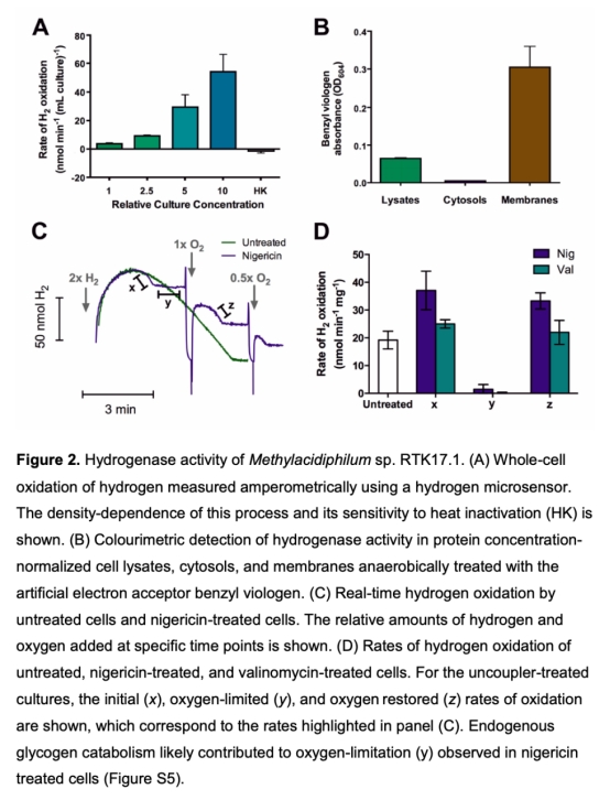 2. 氫氣氧化速率數據:使用丹麥Unisense氫微傳感器測量全細胞氫氣氧化速率,顯示速率與細胞密度成正比,并可低至55 ppmv濃度。數據來自圖2a和圖S3。研究意義在于首次證實疣微菌門甲烷氧化細菌具有氫氣氧化能力,并驗證其高親和力。