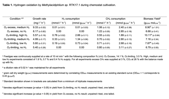 4. 生長產量數據:在恒化器實驗中,測量添加氫氣對生長產量的影響,顯示在氧氣限制條件下氫氣添加使生長產量顯著增加。數據來自表1。研究意義在于證明氫氣氧化能增強混合營養生長,尤其在缺氧環境中提高能量效率。