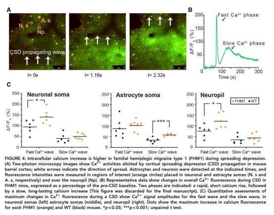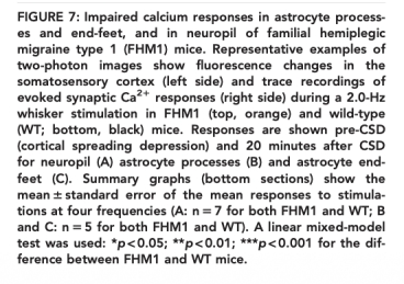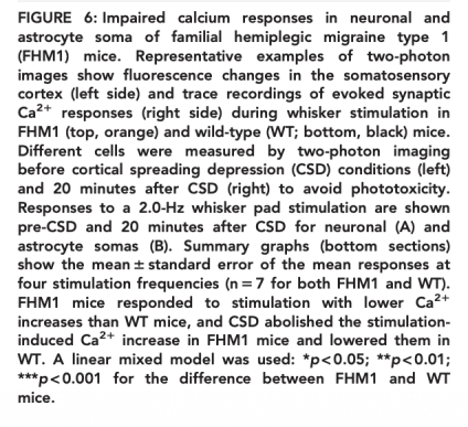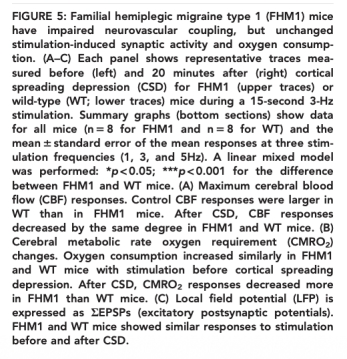 這篇論文研究了家族性偏癱性偏頭痛1型(FHM1)的機制,F(xiàn)HM1是一種由Cav2.1鈣通道增益性突變引起的偏頭痛亞型。研究使用FHM1轉基因小鼠模型(攜帶R192Q突變),通過體內(nèi)雙光子顯微鏡測量體感刺激和皮質擴散性抑制(CSD,偏頭痛先兆的機制)期間神經(jīng)元和星形膠質細胞的鈣離子變化,并結合局部場電位記錄、腦血流測量和氧消耗評估。結果表明,在CSD期間,F(xiàn)HM1小鼠的胞質鈣離子增加比野生型(WT)小鼠更大、更快,并伴有更高的氧消耗,導致組織缺氧,而WT小鼠僅出現(xiàn)中度缺氧。相比之下,在正常網(wǎng)絡活動時,F(xiàn)HM1小鼠的鈣離子和血流響應較小,且CSD后這些響應幾乎消失。使用Cav2.1門控修飾劑tert-butyl dihydroquinone(BHQ)可緩解CSD誘導的鈣變化。研究提示組織缺氧可能是FHM1先兆延長的機制,而正常活動時鈣信號減少可能解釋突變體的神經(jīng)血管響應受損。