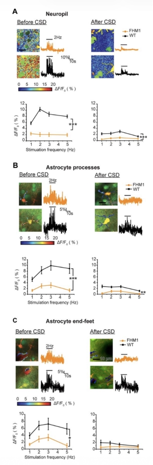 1. 鈣離子變化數(shù)據(jù):使用雙光子顯微鏡測量神經(jīng)元胞體、星形膠質細胞胞體、神經(jīng)纖維網(wǎng)、星形膠質細胞過程和終足在體感刺激和CSD期間的鈣熒光信號。數(shù)據(jù)來自圖4、圖6和圖7。研究意義在于揭示FHM1突變導致CSD期間鈣增加更顯著(尤其在神經(jīng)元和神經(jīng)纖維網(wǎng)),而正常刺激時鈣響應減小,表明突變 alters 鈣穩(wěn)態(tài),影響神經(jīng)傳遞和能量需求,這可能貢獻于CSD易感性和先兆癥狀。