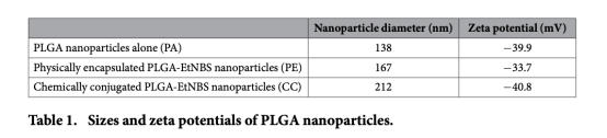 1 納米顆粒尺寸和zeta電位:數(shù)據(jù)來自表1,顯示PLGA納米顆粒的直徑和表面電位,研究意義在于確認(rèn)納米顆粒的穩(wěn)定性和大小,影響其細(xì)胞攝取和分布。