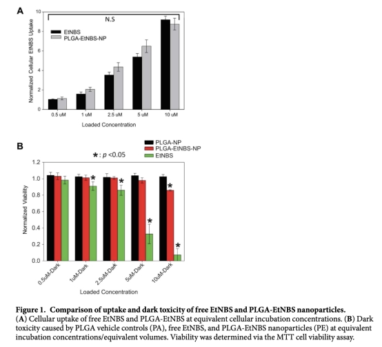 3 暗毒性:數(shù)據(jù)來自圖1B,顯示PLGA封裝顯著減少EtNBS的暗毒性,研究意義在于驗(yàn)證封裝策略的安全性,允許使用更高劑量。