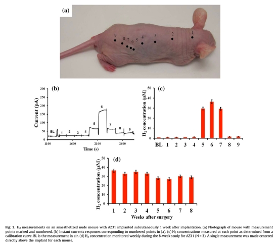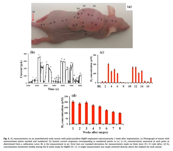 5. 背景氫氣水平的測量:數(shù)據(jù)在圖2c、圖3c中顯示(如尾部、頭部測量點(diǎn))。研究意義是確認(rèn)了小鼠體內(nèi)源自消化過程的背景氫氣濃度很低(約1-7.3μM),遠(yuǎn)低于植入物降解產(chǎn)生的信號,證明了測量的特異性。
