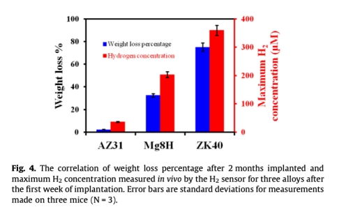 3. 最大氫氣濃度與重量損失百分比的相關(guān)性:數(shù)據(jù)來自圖4。研究意義是建立了傳感器實(shí)時(shí)測量值與最終整體降解程度之間的定量關(guān)系,證明經(jīng)皮氫氣濃度能可靠反映不同鎂合金的相對降解速率(ZK40 > Mg8H > AZ31),驗(yàn)證了該方法的有效性。