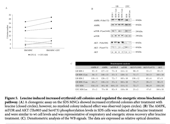 6 信號通路數據:來自圖3。SDS細胞顯示AMPK和mTOR磷酸化增加,表明能量應激響應異常。研究意義是揭示 aberrant 信號通路激活,可能影響細胞增殖和存活。