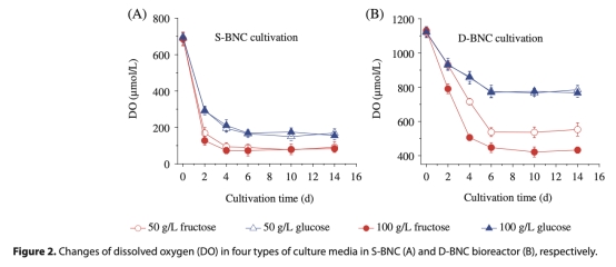 1 溶解氧(DO)變化:數據來自圖2,顯示培養過程中DO的消耗和平衡。研究意義在于揭示氧氣供應對細菌代謝和BNC合成的影響,D-BNC生物反應器由于雙氧供應,DO更高,促進BNC產量。
