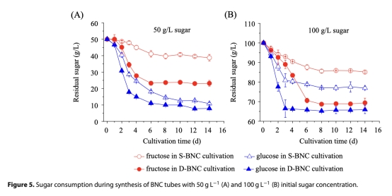 4 糖消耗:數據來自圖5,顯示培養過程中殘糖濃度變化。研究意義在于比較糖利用速率,葡萄糖消耗快于果糖,但果糖更利于BNC合成,D-BNC生物反應器糖消耗更多,產量更高。