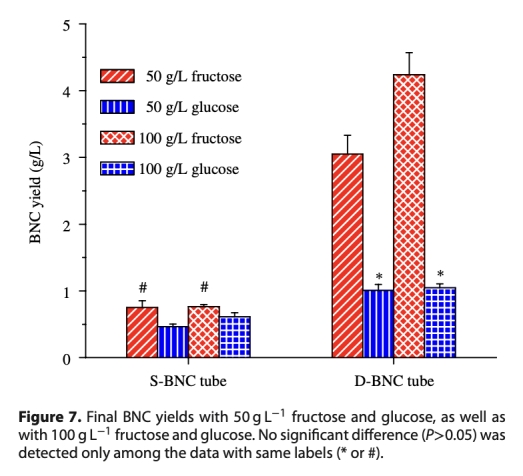 6 BNC產量:數據來自圖7,顯示最終BNC干重。研究意義在于評估不同條件下的產量,D-BNC生物反應器產量更高,尤其使用高濃度果糖時,達4.24 g/L。