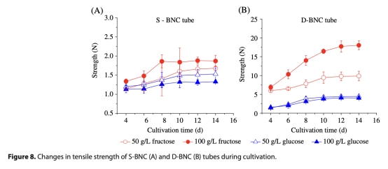 7 拉伸強度:數據來自圖8,顯示BNC管的軸向拉伸力。研究意義在于評估機械性能,隨時間增加,果糖條件強度更高,D-BNC管最強(18.04 N),適用于血管假體。