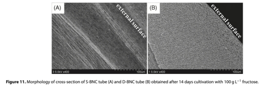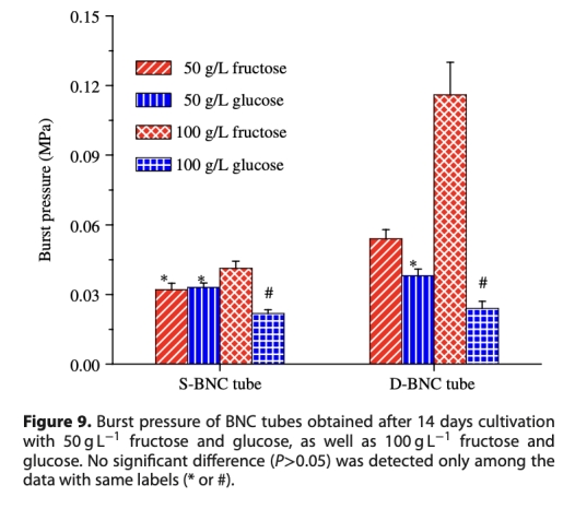結論是果糖作為碳源比葡萄糖更利于BNC生產,賦予更強機械性能;D-BNC生物反應器由于氧氣供應更好,產量更高,管結構均勻,性能優異,適用于人工血管等醫療假體;S-BNC管呈層狀結構,性能較弱,可作為復合材料基礎。通過調節糖類型、濃度和培養時間,可控制BNC管性質。