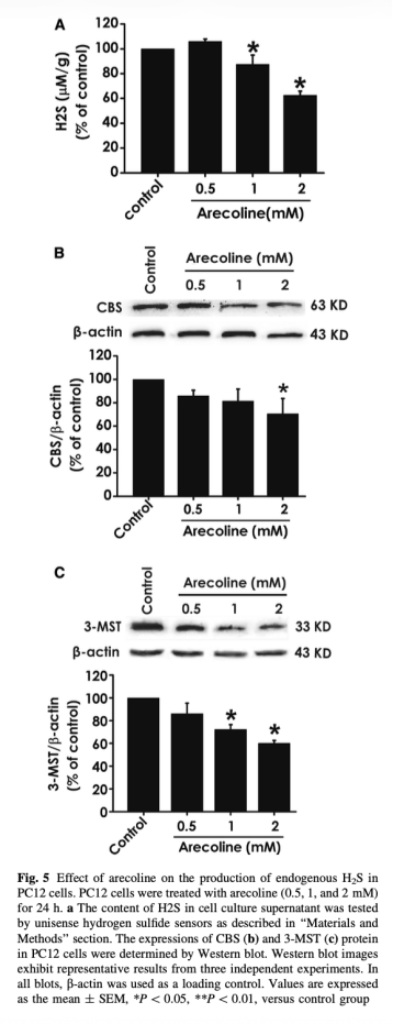 6 CBS和3-MST蛋白表達測量(圖5b和5c):檳榔堿下調CBS和3-MST酶表達。研究意義:說明內源性H2S合成受阻,進一步解釋H2S水平下降的機制。