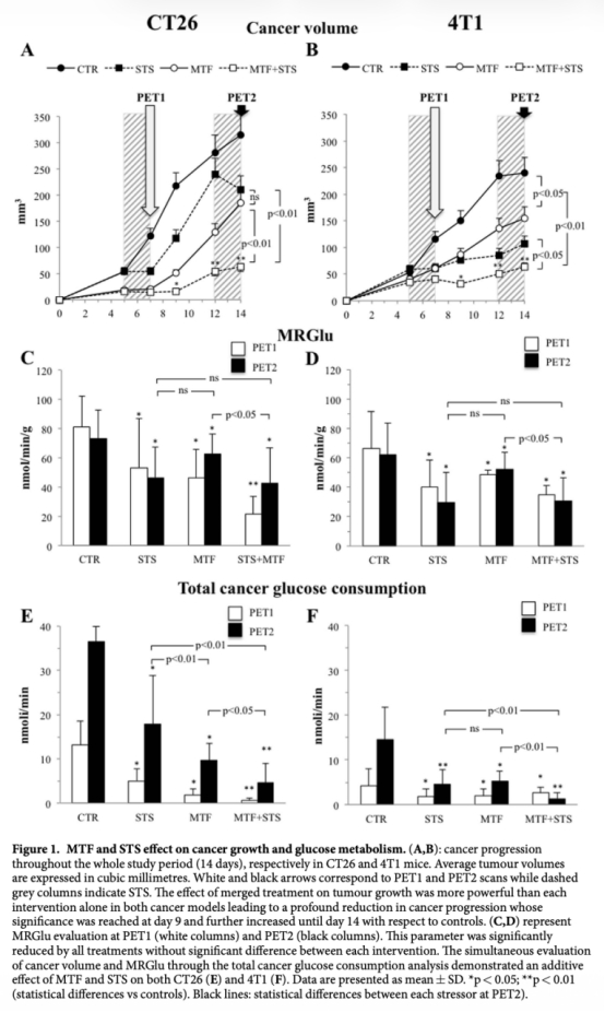論文摘要指出,結合二甲雙胍(MTF)和短期饑餓(STS)能顯著損害結腸癌(CT26)和乳腺癌(4T1)的代謝和生長。饑餓引起的糖酵解通量損害被二甲雙胍通過干擾己糖激酶II活性所增強。聯合治療附加性損害氧化磷酸化:二甲雙胍幾乎廢除復合物I功能;饑餓導致OXPHOS解偶聯,并放大呼吸復合物II和IV的活性,從而結合大量ATP耗竭與活性氧顯著增加。更重要的是,聯合治療在實驗模型中深刻損害癌癥葡萄糖代謝,幾乎廢除病變生長。結果強烈表明能量代謝是減少癌癥進展的有希望靶點。