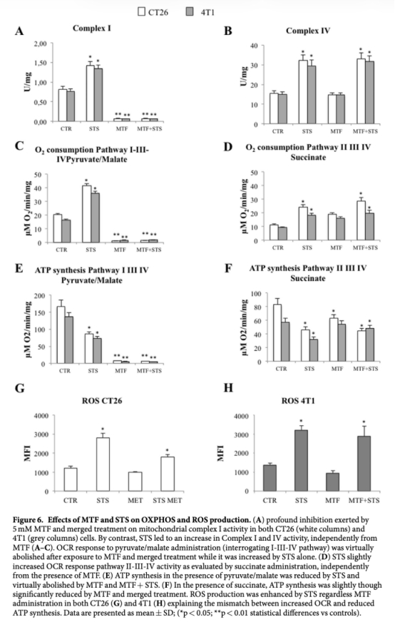 研究思路包括體內和體外實驗。在體內,使用小鼠模型(CT26結腸癌和4T1乳腺癌),通過成像研究(如微PET掃描)評估腫瘤生長和葡萄糖代謝變化。動物分為對照組、STS組、MTF組和聯合治療組,監測腫瘤體積、葡萄糖消耗率等。在體外,使用細胞培養(CT26、4T1細胞和人類成纖維細胞作為對照),通過測量FDG攝取、酶活性、ATP濃度、氧消耗率(OCR)、活性氧(ROS)等,評估二甲雙胍和饑餓對糖酵解和氧化磷酸化的影響。方法包括蛋白質組學、Western blot、酶活性測定、免疫熒光等,以闡明機制。