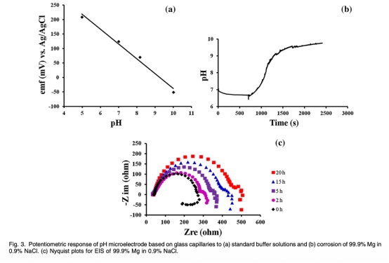 研究思路是設(shè)計并構(gòu)建一個腐蝕表征系統(tǒng)(CCS),集成電位傳感器(pH傳感器、Mg2?離子選擇電極、電化學H?傳感器)和EIS技術(shù),用于同時監(jiān)測鎂腐蝕的多個參數(shù)。在體外實驗中,使用毛細管微傳感器實時測量鎂在鹽水溶液中的pH和Mg2?變化;在體內(nèi)實驗中,利用氫氣微傳感器經(jīng)皮測量小鼠皮下植入鎂合金產(chǎn)生的氫氣濃度。通過校準傳感器、比較不同條件(如溶液組成),并分析時間依賴性數(shù)據(jù),評估腐蝕行為。