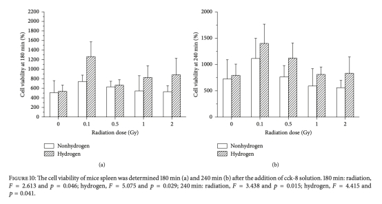 6 淋巴細胞轉化測試:測量脾淋巴細胞增殖能力,研究意義是評估免疫細胞活性,低劑量輻射可能刺激細胞活性,而高劑量抑制,H2能普遍改善細胞活力。數據來自圖10。
