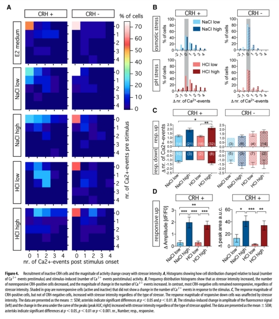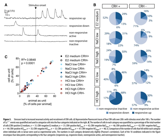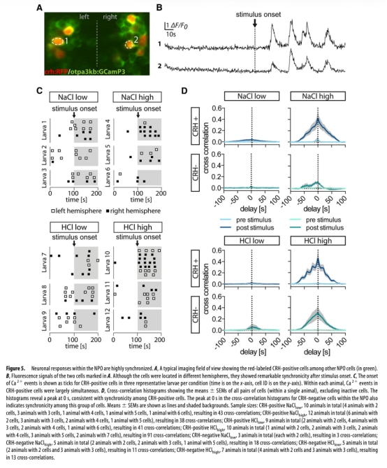 摘要闡述了研究使用雙光子鈣成像技術(shù)在完整斑馬魚幼蟲中記錄促腎上腺皮質(zhì)激素釋放激素(CRH)神經(jīng)元的活動(dòng),發(fā)現(xiàn)當(dāng)動(dòng)物暴露于不同強(qiáng)度的應(yīng)激源(如鹽度和pH變化)時(shí),CRH神經(jīng)元的反應(yīng)幅度與應(yīng)激強(qiáng)度共變。應(yīng)激源導(dǎo)致先前不活躍的CRH神經(jīng)元以強(qiáng)度依賴的方式被募集,從而增加響應(yīng)細(xì)胞池。值得注意的是,應(yīng)激誘導(dǎo)的活動(dòng)在CRH神經(jīng)元之間高度同步,甚至跨半球同步。表明CRH神經(jīng)元的應(yīng)激強(qiáng)度依賴性輸出通過雙重機(jī)制實(shí)現(xiàn),包括個(gè)體細(xì)胞活動(dòng)增加和更大響應(yīng)細(xì)胞池的募集。CRH神經(jīng)元內(nèi)部和跨半球的同步性確保HPA軸的整體輸出與威脅嚴(yán)重程度匹配。