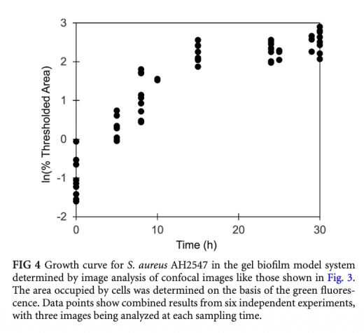 1 細菌生長曲線數據:通過活菌計數和圖像分析測量凝膠中金黃色葡萄球菌隨時間的變化。研究意義:顯示細菌在凝膠中初始快速生長后速率降低,模擬體內生物膜的慢生長特性,與囊性纖維化痰液中的細菌生長率相似。數據來自圖2和圖4。