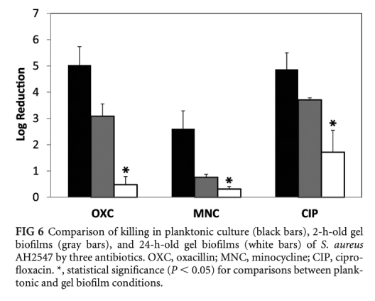 3 抗生素耐受性數據:比較浮游細菌、2小時和24小時凝膠包埋細菌對苯唑西林、米諾環素和環丙沙星的殺傷效果。研究意義:凝膠包埋細菌表現出顯著抗生素耐受,耐受因子達2.8-10.5,模擬了生物膜感染的耐藥特性。數據來自圖6。