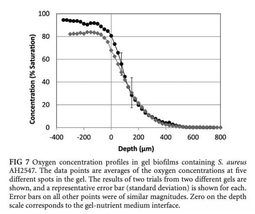 4 氧濃度剖面數據:使用Unisense氧微電極測量凝膠內部的氧分壓隨深度變化。研究意義:直接證實凝膠內存在氧梯度,在500μm深處變為缺氧,支持了生物膜中缺氧微環境的假設。數據來自圖7。