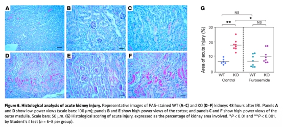 4 測量了缺血再灌注損傷后的腎損傷指標,如BUN、肌酐和KIM-1表達,KO小鼠損傷更嚴重(數據來自圖5和圖6)。研究意義是表明氧效率降低增加腎對缺血易感性。