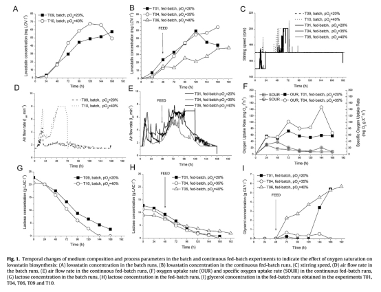 1 氧氣飽和度相關數據:來自圖1,包括洛伐他汀濃度、攪拌速度、空氣流速、氧氣攝取率(OUR)和底物濃度隨時間的變化。研究意義:這些數據顯示氧氣飽和度對洛伐他汀生產有顯著影響,例如pO2=35%時滴度較高,但過高pO2(如40%)可能導致形態破壞和產量下降。結果幫助優化生物反應器的aeration策略,表明氧氣供應需與碳源利用平衡以避免生產抑制。