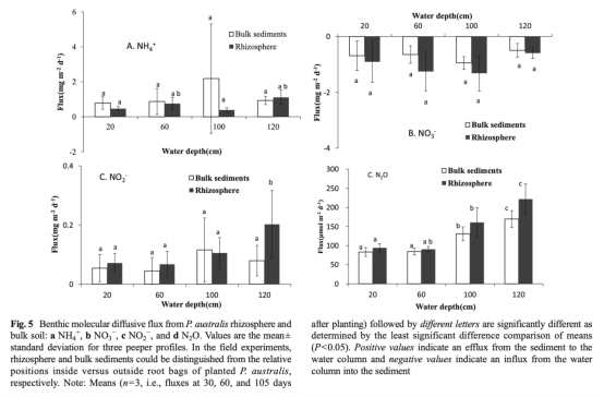 4 底棲擴散通量和N2O排放通量數據:來自圖5和表1。通過Fick定律計算NH4+、NO3-、NO2-和N2O的界面通量。研究意義是量化水深對氮遷移和排放的調控強度,發現根際NO2-通量和N2O排放對水深敏感(>1m時顯著增加),表明深水加劇厭氧過程促進反硝化中間產物積累。
