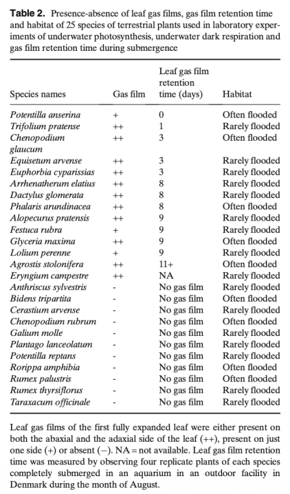 4 氣體膜保留時間數據:來自Table 2。測量了13個物種的氣體膜保留時間,范圍從0到11天。研究意義是評估氣體膜的持久性,顯示其在不同物種中的變異性,但保留時間與洪水事件無顯著相關,表明氣體膜可能不是洪水適應的唯一因素。