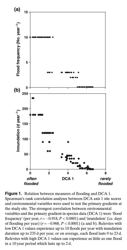 5 物種分布與洪水梯度數據:來自Fig. 1和Fig. 2。通過DCA分析顯示物種組成與洪水頻率和持續時間強烈相關(r=-0.97)。研究意義是揭示環境過濾對物種分布的影響,洪水事件是驅動群落結構的主要因素。