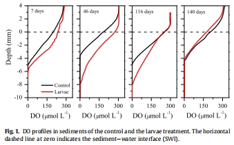 提供關(guān)鍵的機(jī)制啟動(dòng)證據(jù):Unisense微電極提供的毫米級(jí)高分辨率DO剖面(圖1)是證明生物擾動(dòng)發(fā)生及其強(qiáng)度的最直接證據(jù)。數(shù)據(jù)顯示,在有幼蟲處理的沉積物中,氧的滲透深度在第7、46、116天均顯著大于對(duì)照組。例如,在第46天,處理組的氧滲透深度為8.1毫米,而對(duì)照組僅為3.6毫米。這直觀地證實(shí)了幼蟲的生物灌溉行為將上覆富氧水泵入其洞穴,從而在沉積物中創(chuàng)造了局部的氧化微環(huán)境。