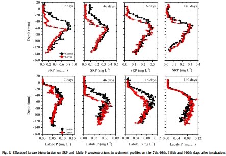 顯著抑制效應(yīng):搖蚊幼蟲的生物擾動(dòng)能顯著降低沉積物表層(最深至70-90毫米)孔隙水中可溶性和活性磷的濃度,最大降幅可達(dá)對(duì)照組的一半以上,并將沉積物從磷的“源”轉(zhuǎn)變?yōu)椤皡R”。