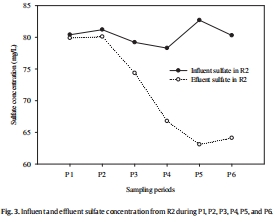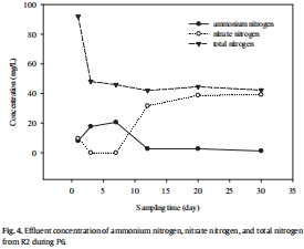 數據內容:在R2中,硫酸鹽濃度從80 mg/L降至64 mg/L(約移除20%);銨態氮先升后降,硝態氮濃度上升,總氮從92 mg/L降至45 mg/L。