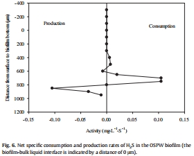 數據內容:基于H?S剖面數據,通過菲克第二擴散定律計算得出,在界面下850微米處H?S生產速率最高,而在650-800微米處存在H?S的消耗(氧化)。